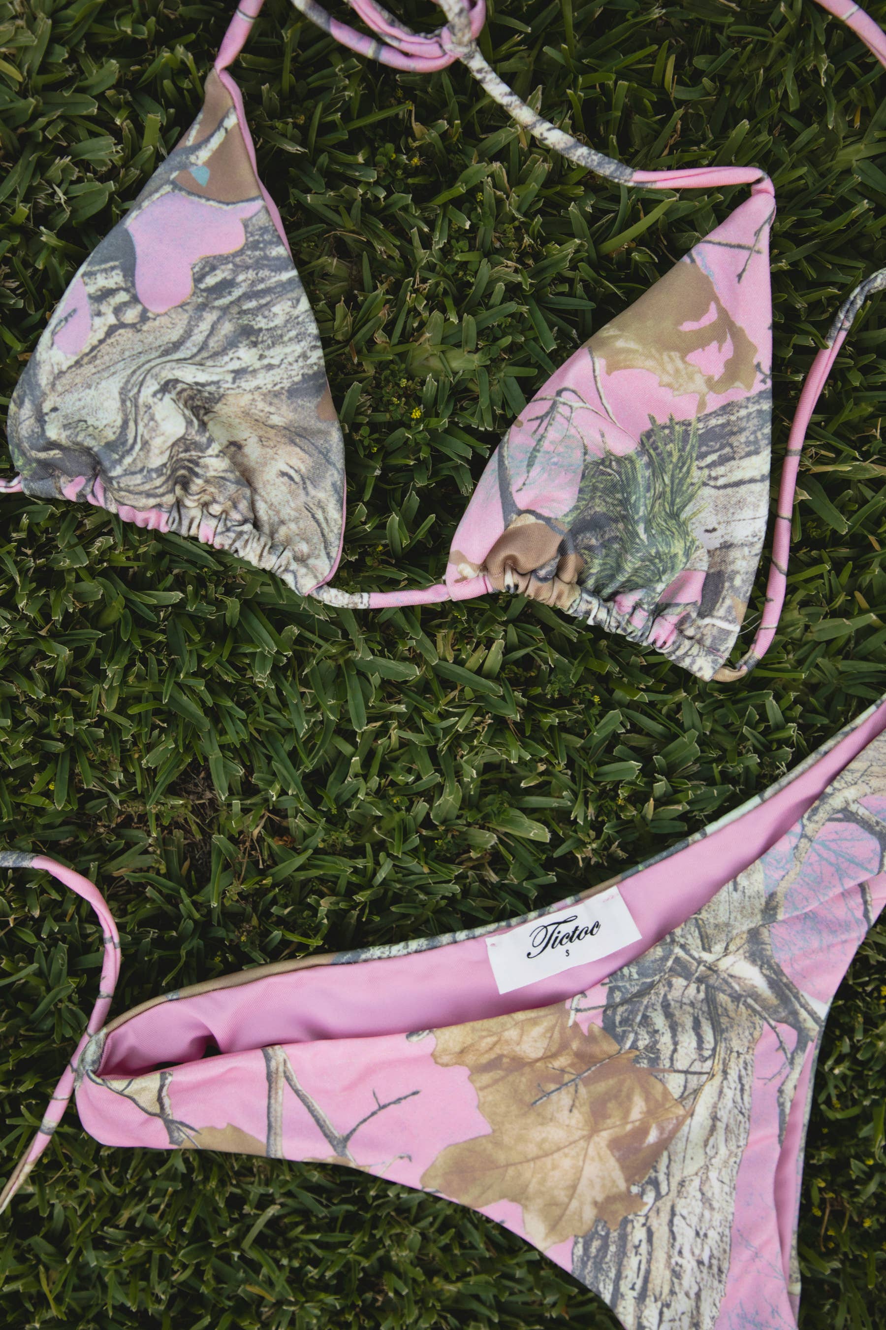 DANIELA Camo Print Triangle Bikini Set Self Tie Halter Straps Matching Low Rise Cheeky Bikini Bottoms Double Lined Stretch Fabric 83% NYLON 17% SPANDEX