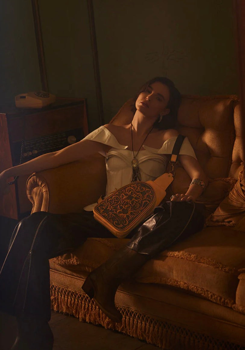 You'll love the style and function perfection of this beautiful bag! It features sumptuous buttercream leather, paired beautifully with a panel of artisan hand-tooled leather in a classic pattern. Wear it on your side, back or front, just as you need. Comfortable, adjustable shoulder strap is ebony canvas and leather. It's perfect for your stylish, on-the-go lifestyle!