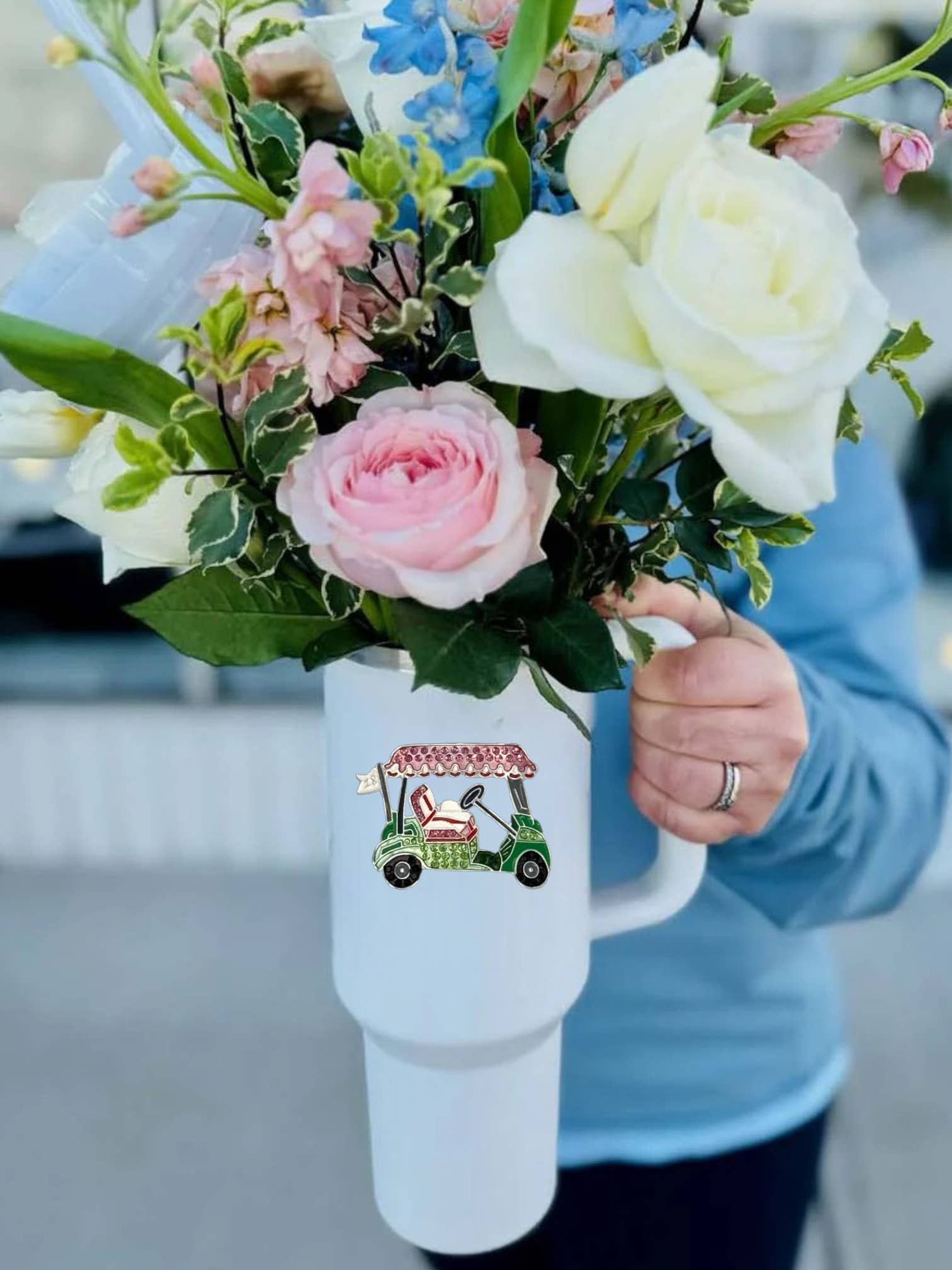 Stay hydrated with this 40oz tumbler featuring a golf cart design. Perfect for golf enthusiasts who need a large, durable tumbler for their time on the course. Hand Wash Only.