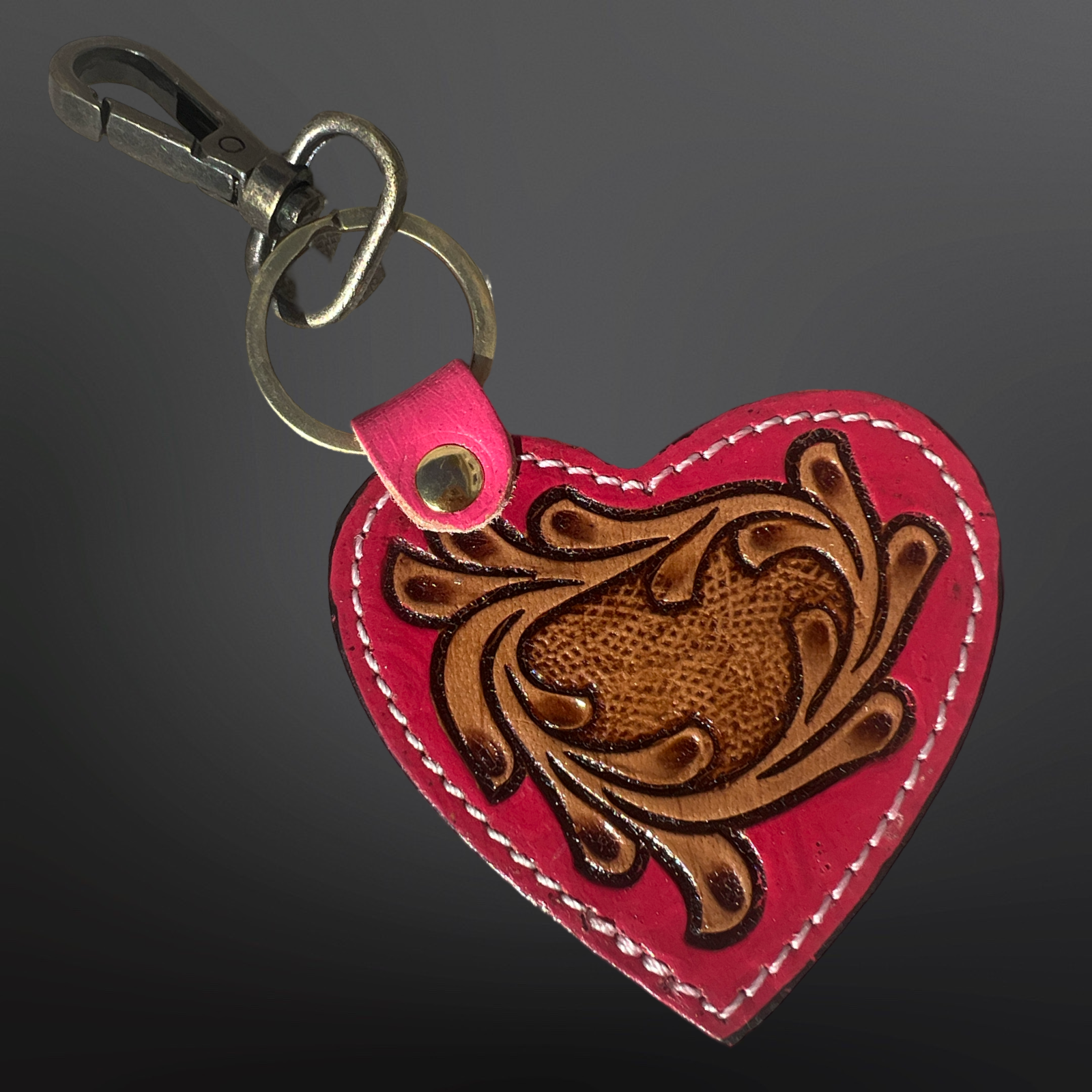 Pink Hand tooling on a leather keychain? YES PLEASE! Simple and elegant and a subtle statement of your love of country life. Measures 2.75” wide.