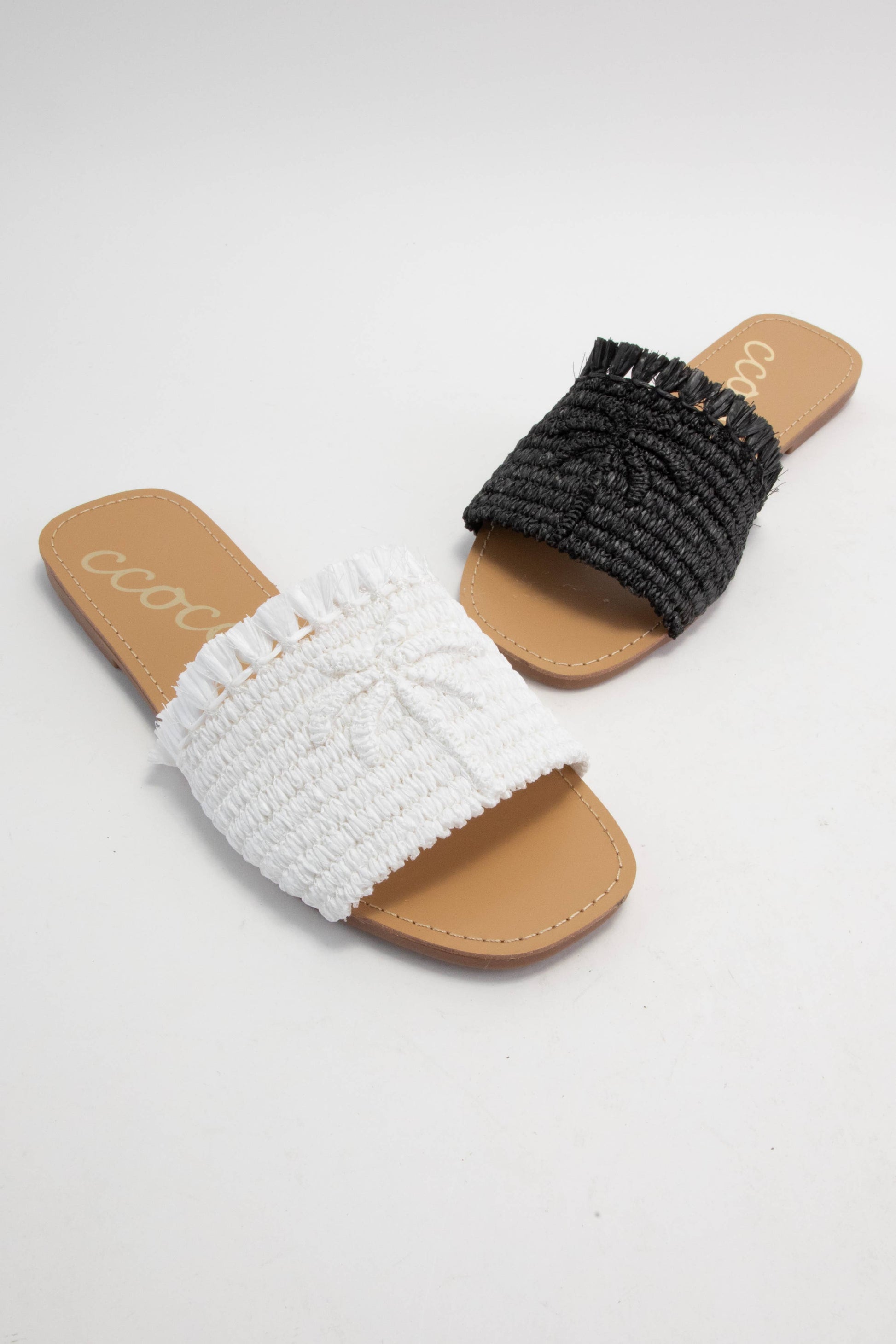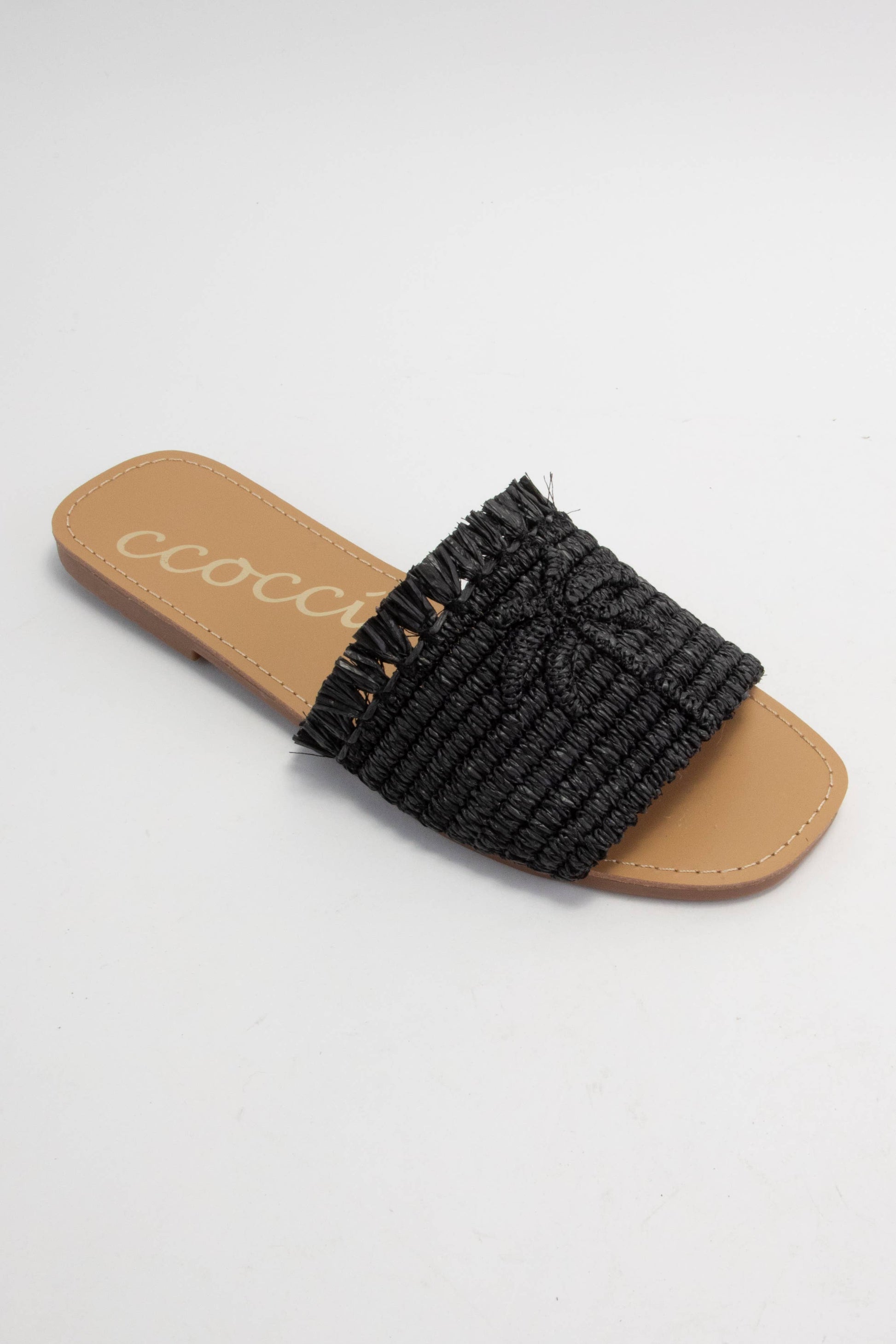 PALM TREE EMBROIDERY DESIGN ON RAFFIA WOVEN UPPER SLIP-ON SANDAL