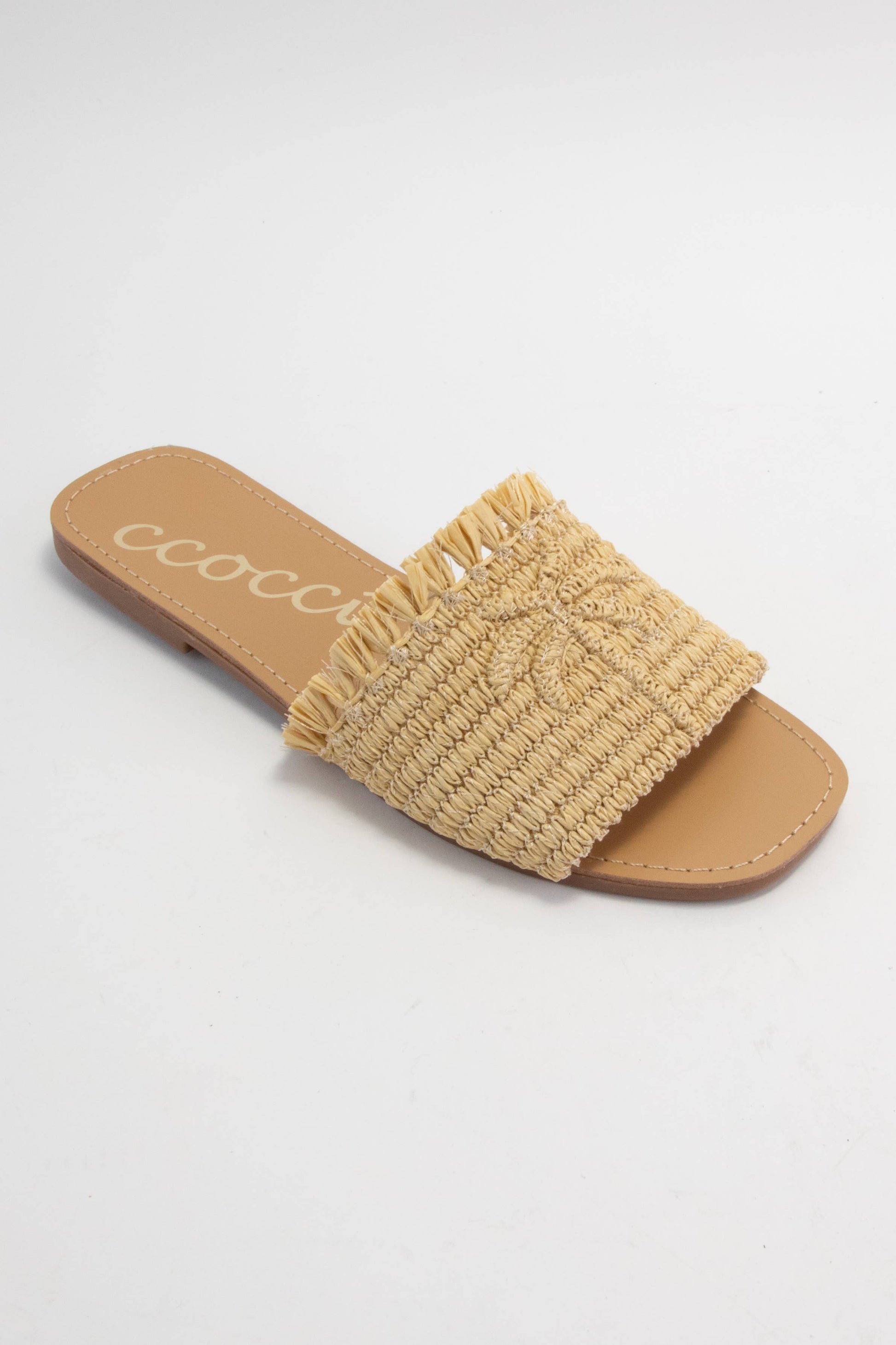 SANDY PALM TREE EMBROIDERY DESIGN RAFFIA SANDAL: CAMEL / A12