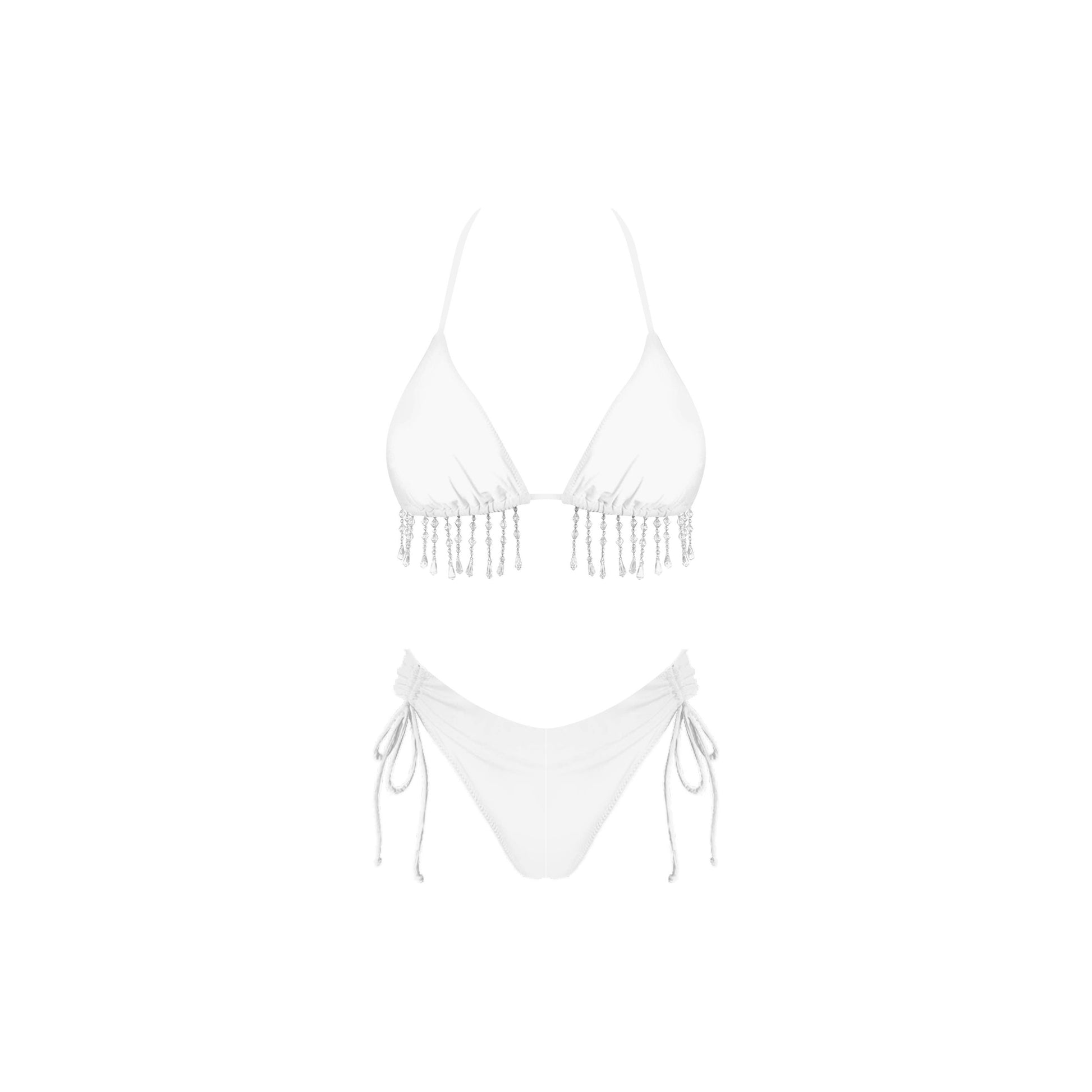 Inspired by the luminescent quality of pearls often depicted in still life paintings, the Pearl Drop bikini is the epitome of refined elegance. The pure white fabric serves as a canvas, allowing the intricate fringe to mimic the gentle drop of pearls cascading delicately down. Each fringe detail is meticulously designed to capture the subtle shimmer and grace of crystals, creating a mesmerizing effect. Perfect for sun-soaked days and moonlit beach strolls, this bikini set combines sophistication with a touch of artistic flair, making you feel like a living masterpiece.