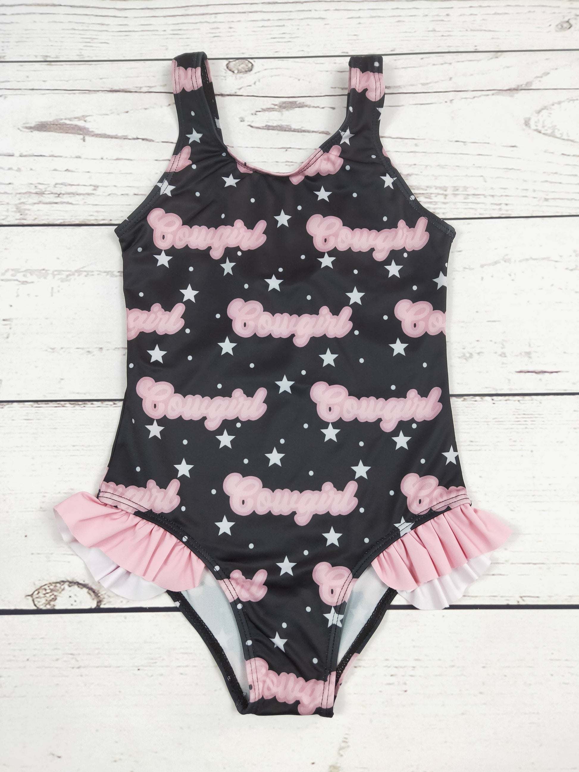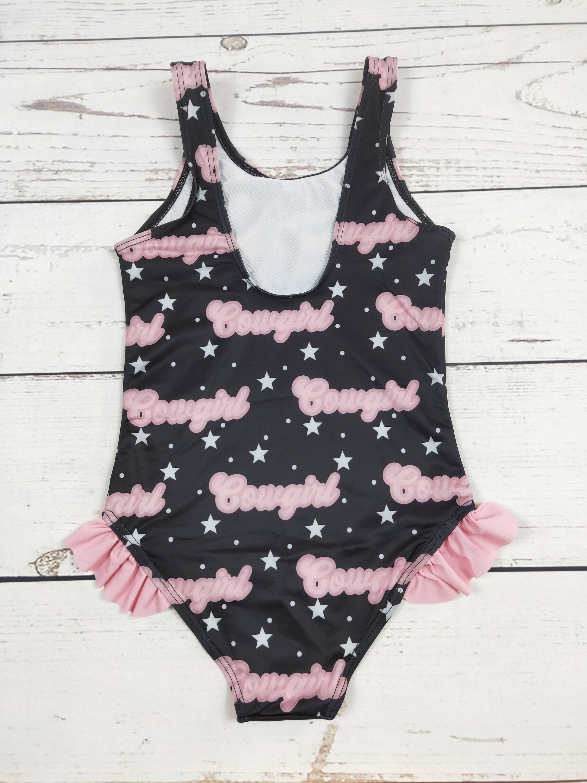 Cowgirl One Piece Girls Summer Swimsuit ETA: 8-10 Days Get your little cowgirl ready for summer with this stylish and practical swimsuit. Made with quality materials and designed to last through all her summer adventures, this one piece is perfect for any little girl who loves to have fun in the sun. With an ETA of 8-10 days, you won't have to wait long to see her loving her new swimsuit!