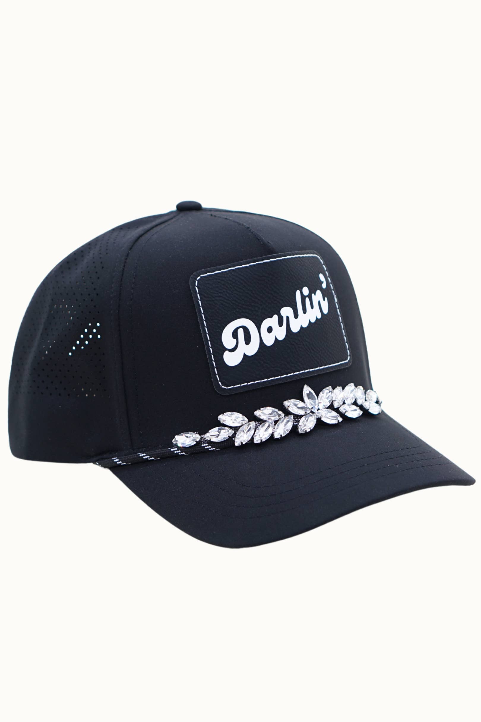 DARLIN' - Bejeweled glitz athletic trucker cap with leatherette detail. 100% polyester for comfort, performance and style. Fused buckram backing, laser perforation for enhanced airflow, two-tone braided rope and a moisture-wicking sweatband that keeps you cool and dry. Adjustable plastic snapback, osfm.
