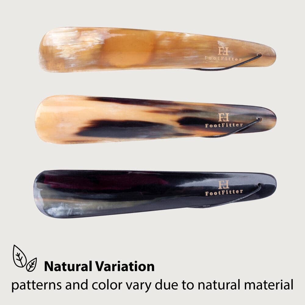 FootFitter Genuine Bull Horn Shoe Horn is made of 100% real bull horn. Bull horn is a beautiful material that becomes pliable when heated. Because it is a natural material, it has a unique feel to it and looks beautiful when polished and finished. Due to the nature of the material, the patterns and color range will vary from one to the next. Comes with a convenient leather strap for easy storage.