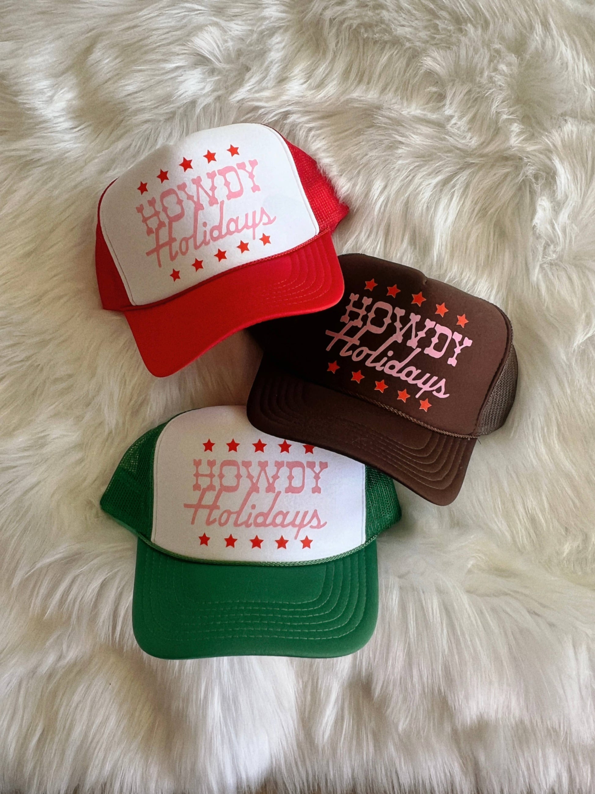 Customizable high crown, foam or structured, adjustable snap back trucker hat detailed with our pink and red "Howdy Holidays" design. One size fits most.