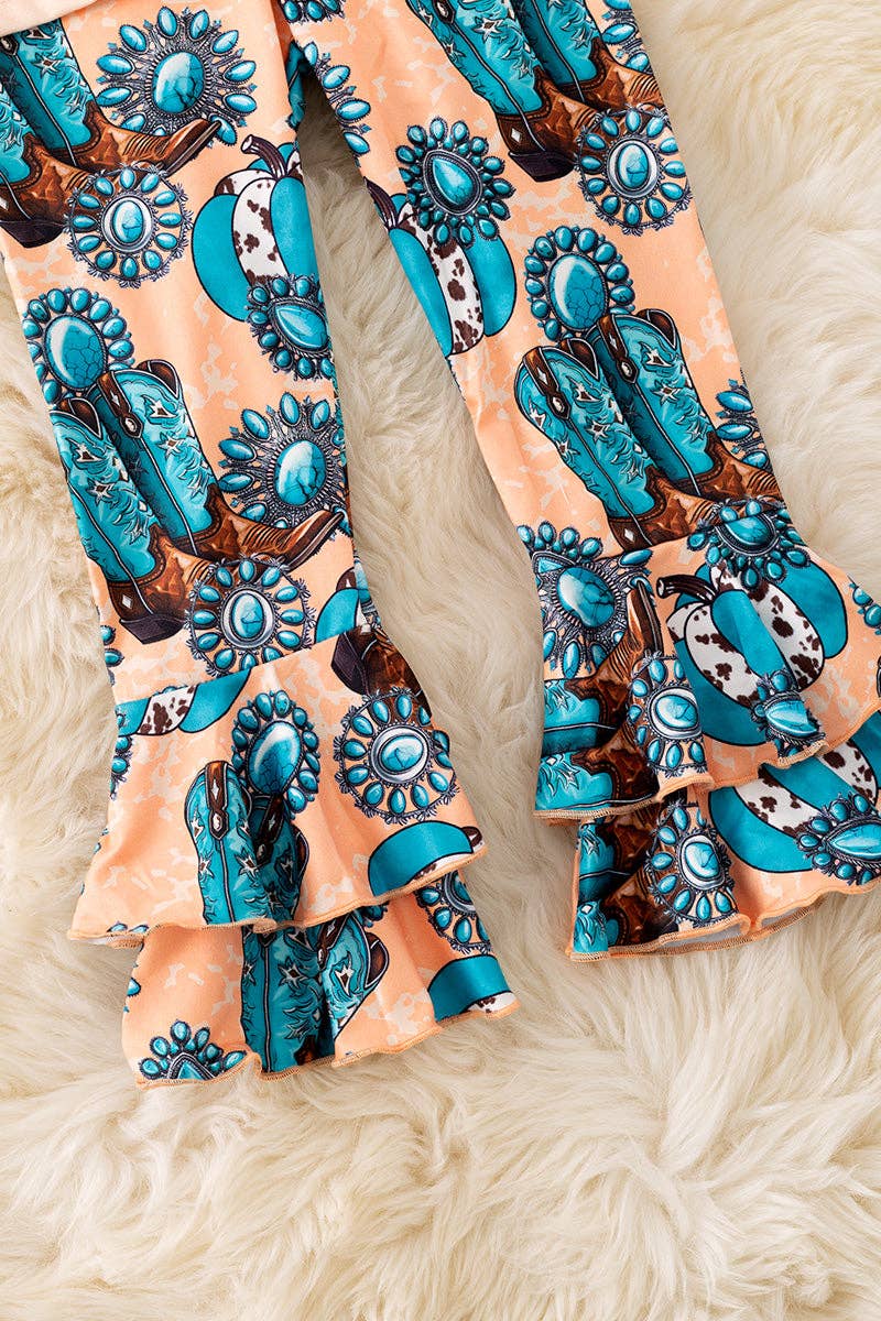 This "Howdy" set features an ivory long sleeve top paired with western-inspired double layer bottoms, combining classic style with functional design. The top offers comfortable coverage, while the layered bottoms add dimension and durability, perfect for active wear with a touch of rustic charm. Ideal for those seeking a blend of timeless western aesthetics and practical comfort.