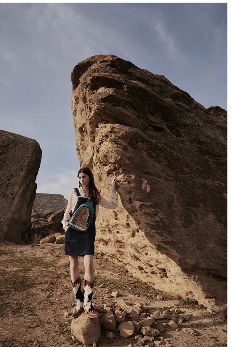 This magnificent sling backpack combines amazing design style with ease of movement. It features gorgeous turquoise blue leather, and an amazing panel of hand-tooled leather on the front, with a striking accent of hair-on hide. Several zippered compartments add convenience. It's designed for you to wear it on your side, or on your back or front, just as you need. Comfortable, adjustable shoulder strap is duo-tone canvas and leather. It's perfect for on-the-go lifestyles!