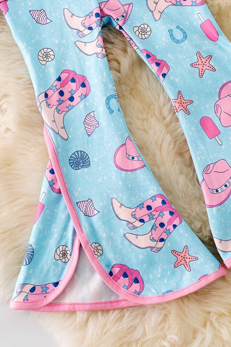 This girls' western printed 2-piece set includes a pink angel sleeve cowgirl boot top and blue pants. Perfect for any cowgirl-in-training, this stylish set offers both comfort and country charm. Show off your little one's love for the wild west with this adorable outfit.