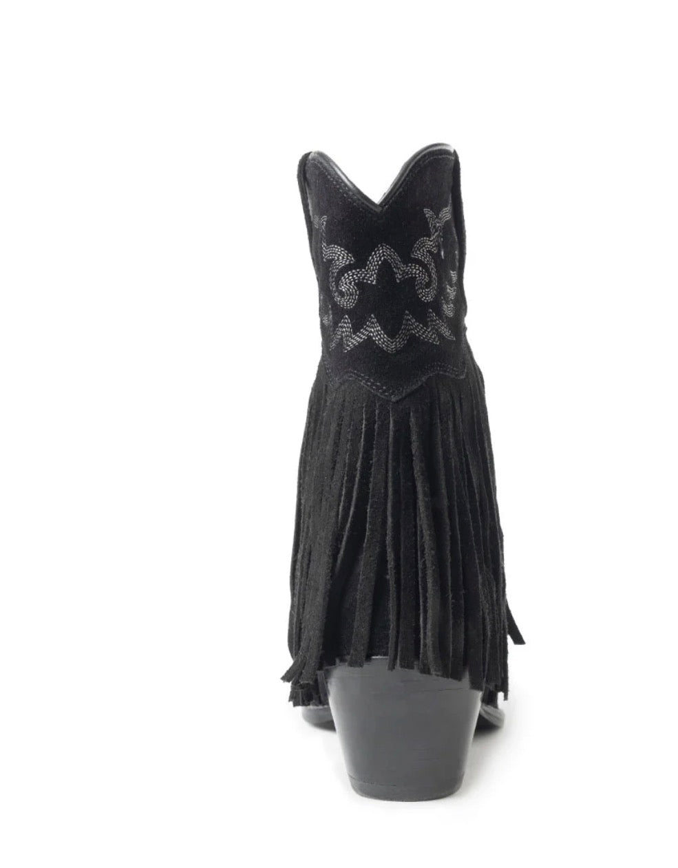 Dance into the night - or take on the work day - with these dramatic black suede boots! Playful fringe cascades from the shaft, while silver embroidery adds a subtle sparkle. The classic Western silhouette gets a modern edge in this versatile ankle-height design.